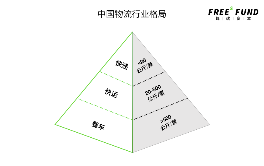 物流行业的市场格局是个正金字塔,最下面是载重超过 500 公斤的整车物流;中间层是快运,货量介于 20 公斤到 500 公斤;最顶部是 To C 端物流,也就是我们日常接触的快递,货量通常小于 20 公斤。